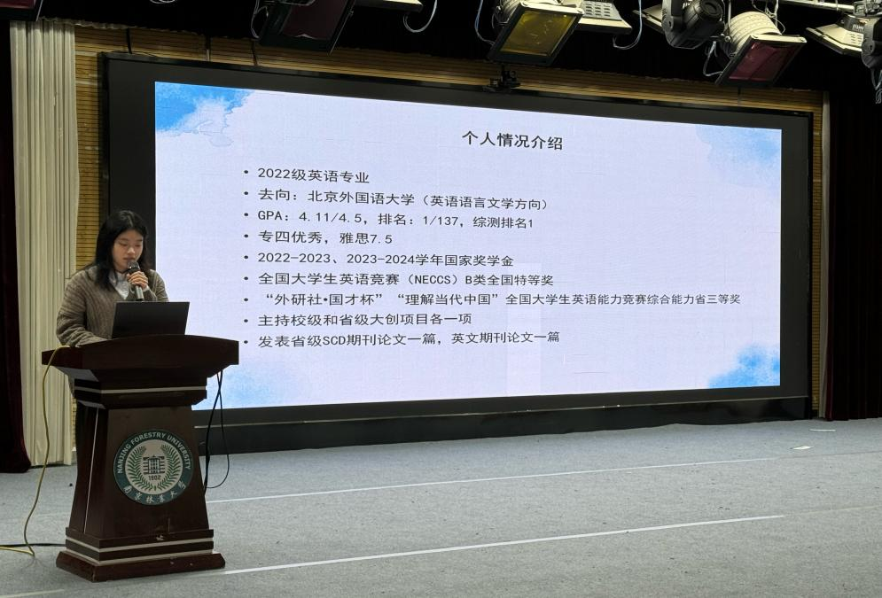 学院2022级英语专业学生雷梓璇聚焦学科竞赛为大家展开深入详实的介绍。她重点解析了“外研社·国才杯”系列赛事,从各竞赛环节的备赛策略到心态调整技巧,层层递进,为同学们提供了清晰实用的备考指南。2022级英语专业学生高馨彤从翻译专业的行业现状与个人发展的实际利弊切入,为学弟学妹们犀利点拨,精准剖析了翻译方向漫漫保研路上的挑战与机遇。2022级学生张为苏成功入选校研究生支教团,她围绕支教保研内容,以“保研新路径:在实践中沉淀成长”为题,系统介绍研究生支教团的选拔机制、服务内容及相关政策,结合自身经历,鼓励大家多参与锤炼专业能力与责任担当的重要实践。2022级学生张俊颢围绕英语专业学习与方法,聚焦“英语学习的‘破局之道’”,以参与英语角的转变为例,鼓励新生打破表达壁垒,让语言学习真正学为所用。学院2023届英语专业毕业生陈思颖校友围绕“慢节奏里的快成长”主题,分享自身从南林本科毕业至北外读研阶段的学习生活,引导同学们积极参与各类专业实习实践,勇敢面对各类挑战与失败,在各种机会的锻炼中积蓄成长力量。