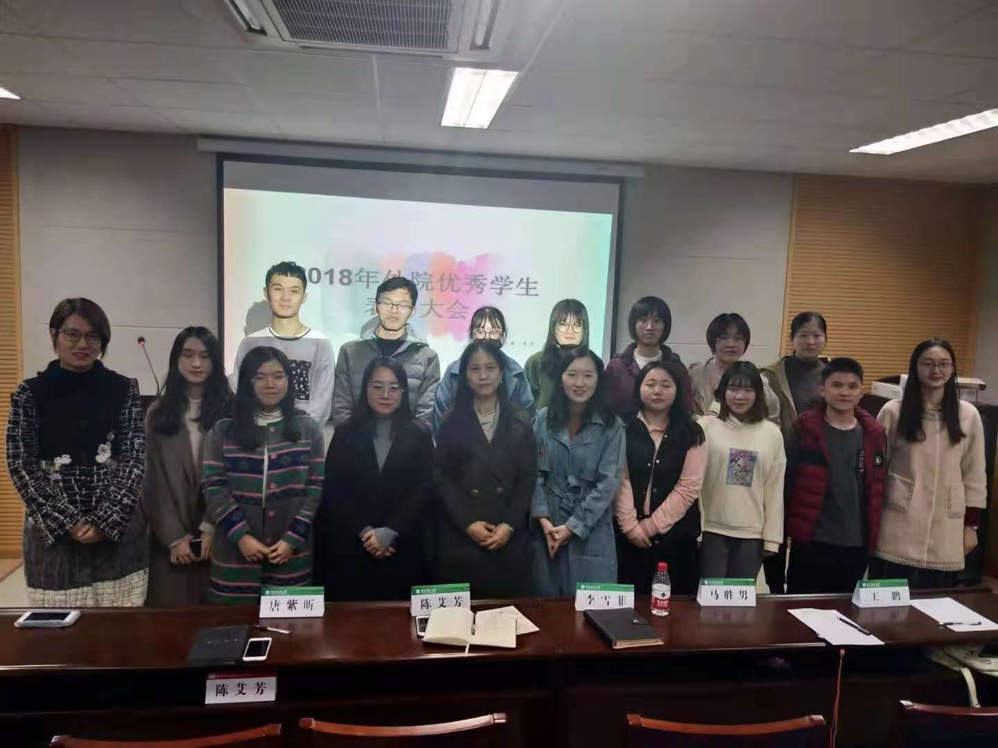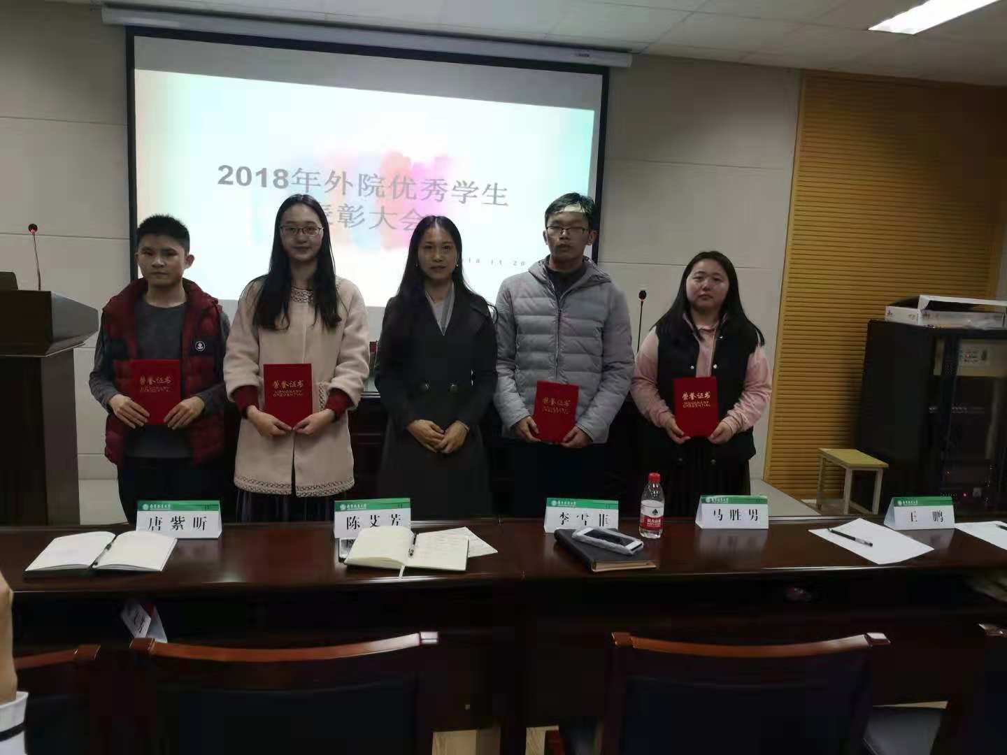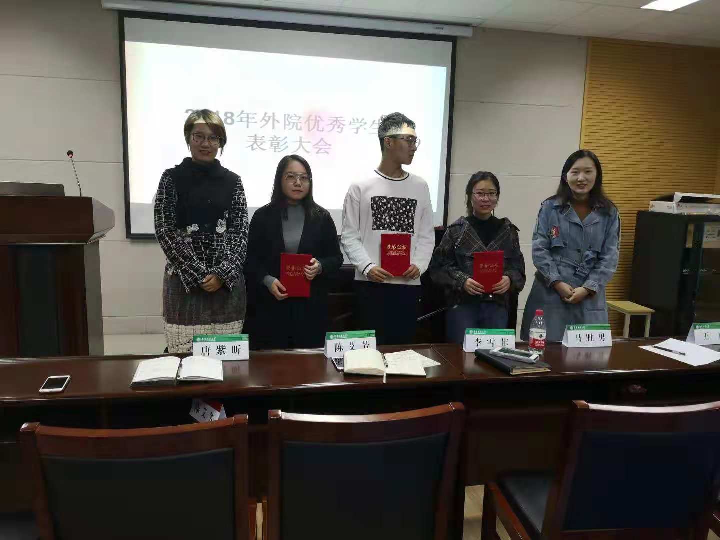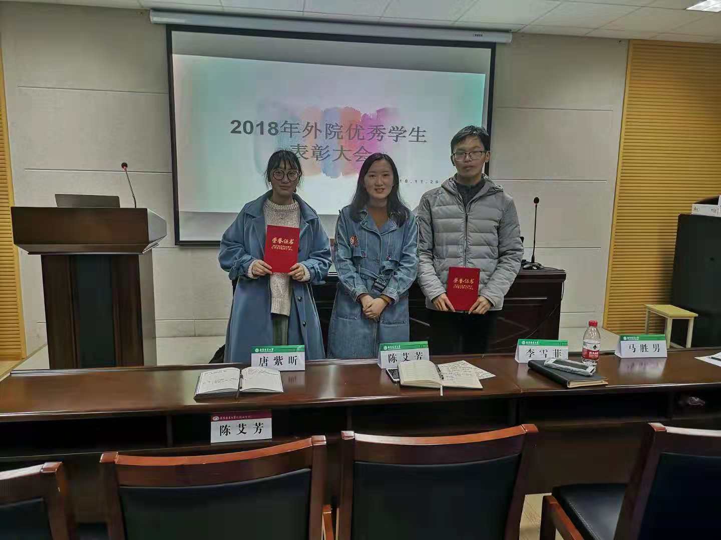 11月29日下午,我院社会实践优秀学生表彰大会在学院会议室B226举行。院党委副书记兼副院长陈艾芳、院团委书记兼学工办主任李雪菲、外语院辅导员兼组织员唐紫昕、助理辅导员、全体团工委学生以及各班级团支书参加了大会。会议由团工委学习实践部部长吴芮姝主持。大会开始,葛莎莎同学代表研究生社会实践团队介绍了他们暑期实践项目――“商业景区的改造对生态环境以及附近居民生活的影响”;吕鹏同学代表本科生和研究生联合团队介绍了暑期社会实践项目――“传播丝路精神,暑期社会实践江苏行”,吕鹏从团队构成、地方选择、团队协作、媒体宣传等四个方面对活动进行了总结;大二学生刘雨乐和潘旭艳同学代表赴美带薪实习调研团队,分享了在美国工作的亲身亲历与所思所感。项目介绍完毕,陈艾芳、李雪菲和唐紫昕三位老师分别为社会实践和宣传工作优秀学生们颁发了表彰证书。大会最后,陈艾芳做了总结发言,她指出,社会实践对于大学生了解社会、认识国情、增长才干、奉献社会、锻炼毅力、培养品格具有重要意义,学院将通过社会实践常态化、微小化、融合化,通过打造“外院榜样,青春领航”,通过榜样带动,全员参与,鼓励更多的同学参与进来、有所收获、有所展示。她对在座同学们提出了新的要求与期待,以做更优质的社会实践活动为平台,全面提升学院学生的家国情怀和国际视野。文编:周兴融审核:李雪菲照片:陈彦潼